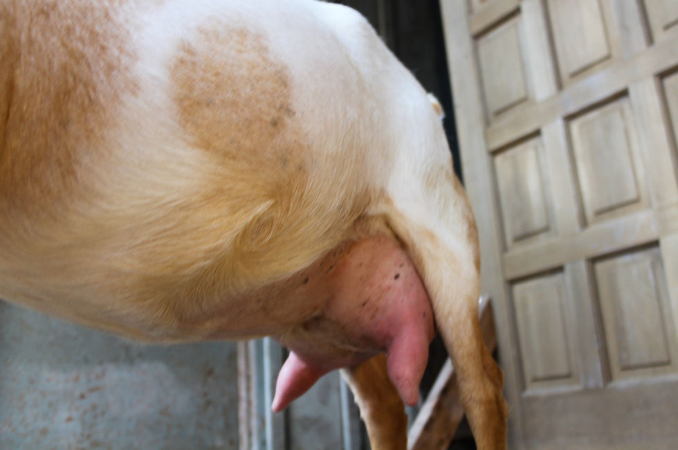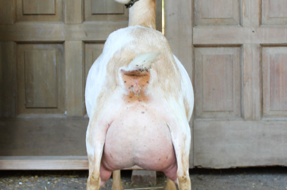 Camembert is such a beautiful and well mannered man. He has been a pleasure to work with for our v-shows. He has such a mild and willing temperament.We just love him. Sadly he was so closely related to all my does that I did not really get to use him a bunch until last year. I have three of his does in my herd that kidded in January and he did indeed pass on his sire, Noahs, wonderful mammary! Noahs Kids are known to be wide throughout with nicely attached easy to milk udders. Noahs daughters (Camemberts sire and grandsire) all milk test at least 4 lbs per day at a tiny 18 inches tall!!